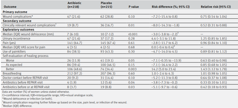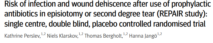 Perslev K, Klarskov N, Bergholt T, Jangö H. Risk of infection and wound dehiscence after use of prophylactic antibiotics in episiotomy or second degree tear (REPAIR study): single centre, double blind, placebo controlled randomised trial. BMJ. 2025;391:e084312. Published 2025 Oct 29. doi:10.1136/bmj-2025-084312