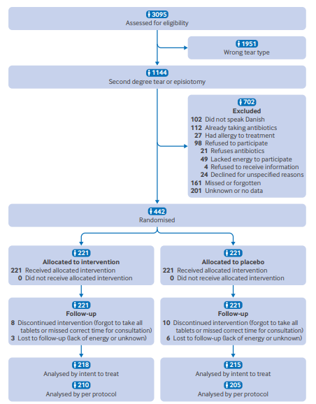 REPAIR研究于2023年3月至12月在丹麦首都地区一家大学医院进行,共纳入442名接受会阴切开或二度撕裂缝合的产妇。排除标准包括抗生素过敏、24小时内已使用抗生素、非丹麦语使用者、剖宫产或会阴切开延伸至肛门括约肌者。参与者被随机分配至干预组或安慰剂组:干预组接受三次口服阿莫西林(500 mg)+ 克拉维酸(125 mg),首剂在产后6小时内服用,后续每8小时一次;安慰剂组接受外观相同的钙片。研究采用双盲设计,随机化由药房执行,确保研究者、参与者和统计分析人员均不知分组情况。