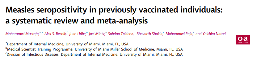 Mustafa, Mohammed et al.Measles seropositivity in previously vaccinated individuals: a systematic review and meta-analysis.eClinicalMedicine, Volume 0, Issue 0, 103564
