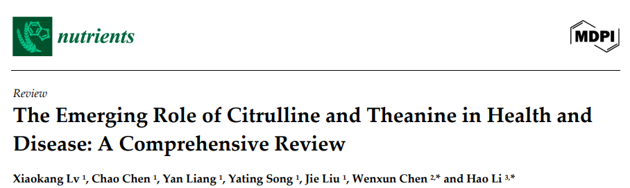 Lv, X.; Chen, C.; Liang, Y.; Song, Y.; Liu, J.; Chen, W.; Li, H. The Emerging Role of Citrulline and Theanine in Health and Disease: A Comprehensive Review. Nutrients 2025, 17, 3496. https://doi.org/10.3390/nu17213496