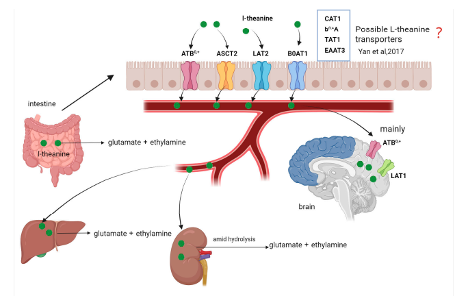 图:L-茶氨酸的转运与代谢
