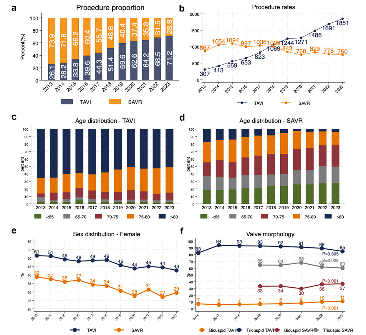 2013年至2023年间,TAVI手术量从307例(占所有主动脉瓣置换的26.1%)显著上升至1851例(71.2%),而SAVR手术量在2018年前保持稳定,之后略有下降,2023年为750例。这一趋势反映了TAVI在瑞典临床实践中的迅速普及。值得注意的是,TAVI联合经皮冠状动脉介入治疗(TAVI + PCI)的比例从11.3%下降至6.8%,而SAVR联合冠状动脉旁路移植术(SAVR + CABG)的比例维持在31%–35%之间,提示两种策略在合并冠状动脉疾病患者中的选择差异。