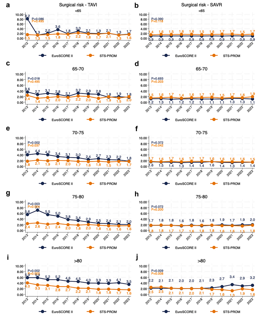 图:2013–2023 年间按年龄组分层的 TAVI 和 SAVR 患者 EuroSCORE II 与 STS-PROM 的时间趋势