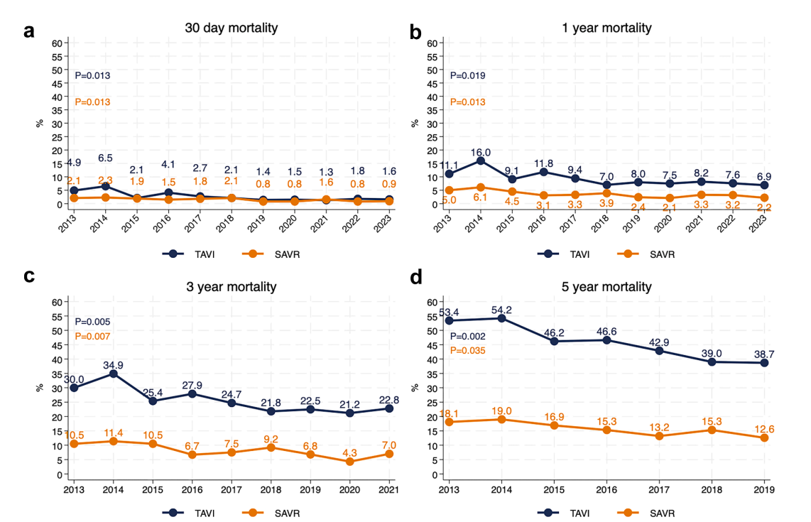 图:2013–2023 年间 TAVI 和 SAVR 患者术后 30 天、1 年、3 年和 5 年全因死亡率的时间趋势