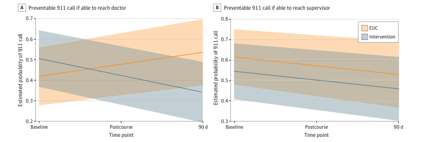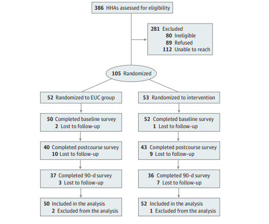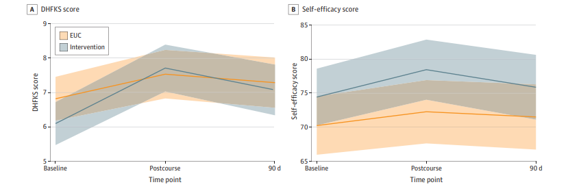 研究人员于2022年5月至2024年5月在纽约一家大型家居护理机构开展,纳入102名为心衰患者提供护理的HHAs,随机分为增强常规护理组(EUC,接受心衰培训)和干预组(接受培训+移动健康应用通讯功能)。研究在基线、中期(培训后45天)和90天随访时评估HHAs的心衰知识(使用荷兰心衰知识量表DHFKS,0-15分,分数越高,知识越丰富)和护理自我效能(使用心衰护理自我效能量表,0-100分,分数越高,自我效能越强)。次要结局包括自报的可预防911急救呼叫比例,探索性结局为患者急诊访问和住院情况。数据采用线性混合效应模型分析。