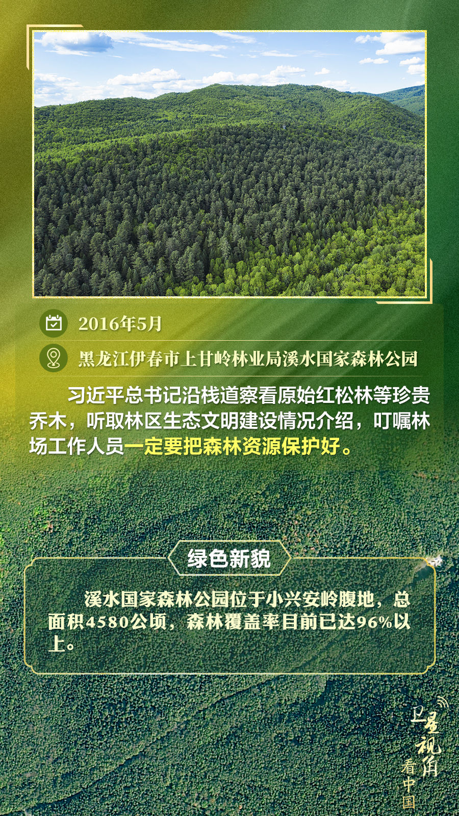 经由过程卫星视角,一路俯瞰总书记去过的这些林区,重温总书记对造林护林的殷殷嘱托,感触感染绿色新貌。