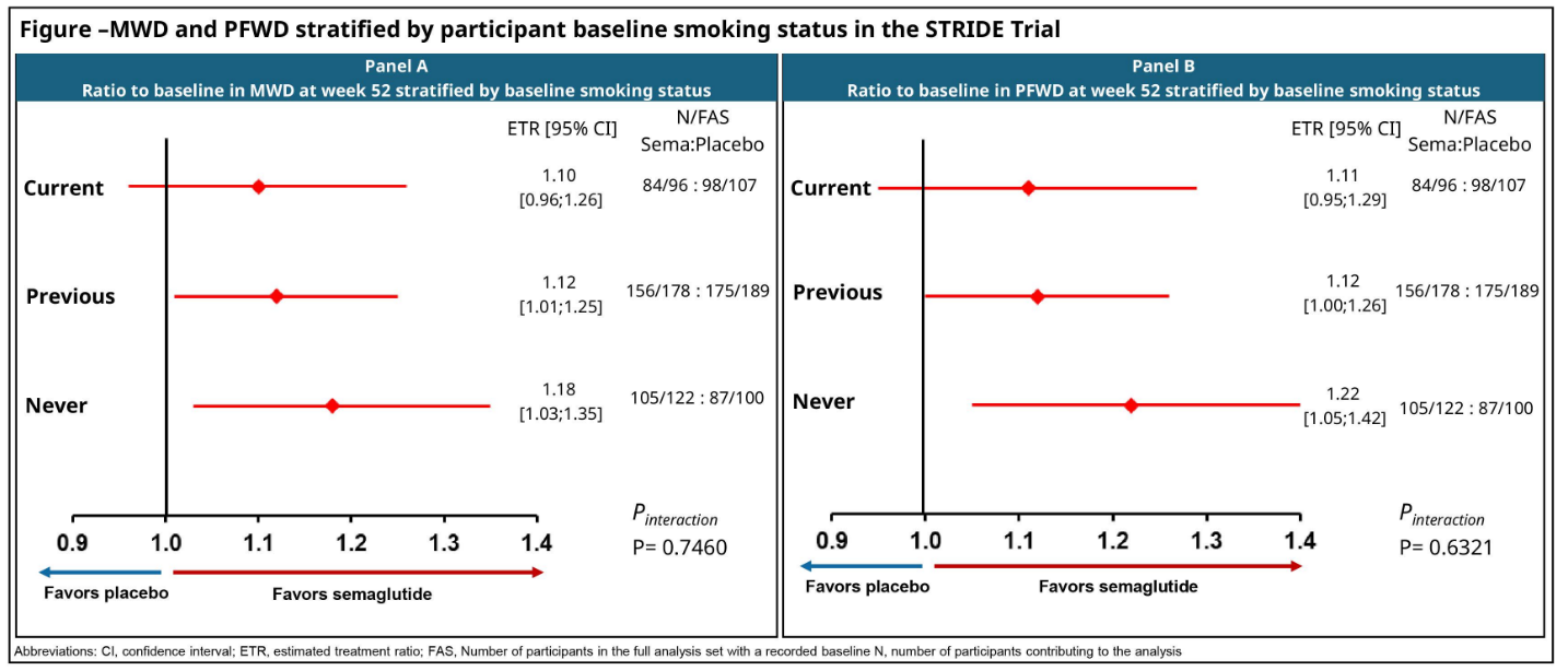 试验的主要终点是最大行走距离(MWD)的变化,次要终点包括无痛行走距离(PFWD)。 在PAD患者群体中,吸烟状态的不同可能对治疗效果产生影响,然而这一点在此前研究中鲜有深入分析。本次基于STRIDE数据的事后分析,重点探讨semaglutide的疗效是否受吸烟状态影响,从而为临床个体化疗法提供依据。