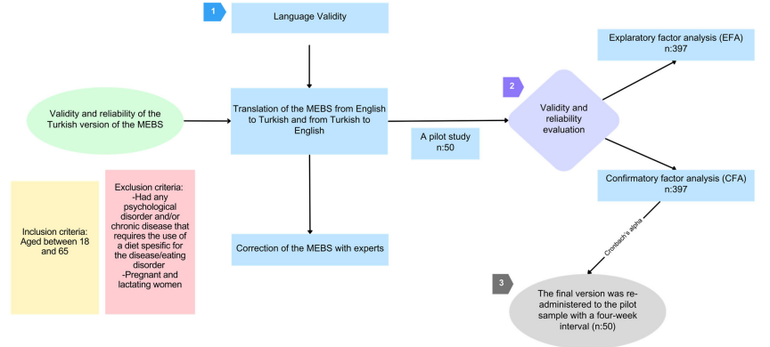 本研究采用横断面设计,于2023年9月至12月在土耳其伊斯坦布尔招募397名18-65岁成人参与者,通过滚雪球抽样法涵盖不同社会经济及教育背景。研究分三阶段:第一阶段进行量表的语言学翻译、反向翻译及文化适应,并由专家小组评估内容效度;第二阶段采用心理测量学方法实施探索性和验证性因子分析,检验量表结构及内部一致性;第三阶段进行50人样本的测试-重测信度评估,间隔四周。排除有慢性疾病需特定饮食、心理障碍、进食障碍、孕产妇及未同意参与者。所有数据通过安全在线平台采集,确保数据标准化。 MEBS由17个条目组成,采用5点李克特量表评分。包括四个子维度:专注饮食(5项)、饥饿与饱腹感信号(5项)、带意识的饮食(3项,反向计分)和无分心饮食(4项,反向计分)。评分时各子量表独立计算总分,不建议合并总分。缺失数据处理原则为每个子量表缺失超过20%则剔除,剩余缺失采用均值填补。