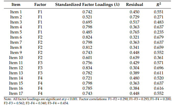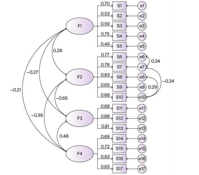 结果显示,参与者中女性占61.2%,男性占38.8%,平均年龄28.8±9.71岁。数据满足因子分析假设,KMO系数为0.85,Bartlett球形检验显著(χ²=2960.80,p<0.05),适合因子分析。EFA和PCA均支持四因子结构,累计解释变异64.01%,因子载荷介于0.50至0.85间。进一步PAF伴Promax旋转确认因素结构稳健,解释变异达65.6%。