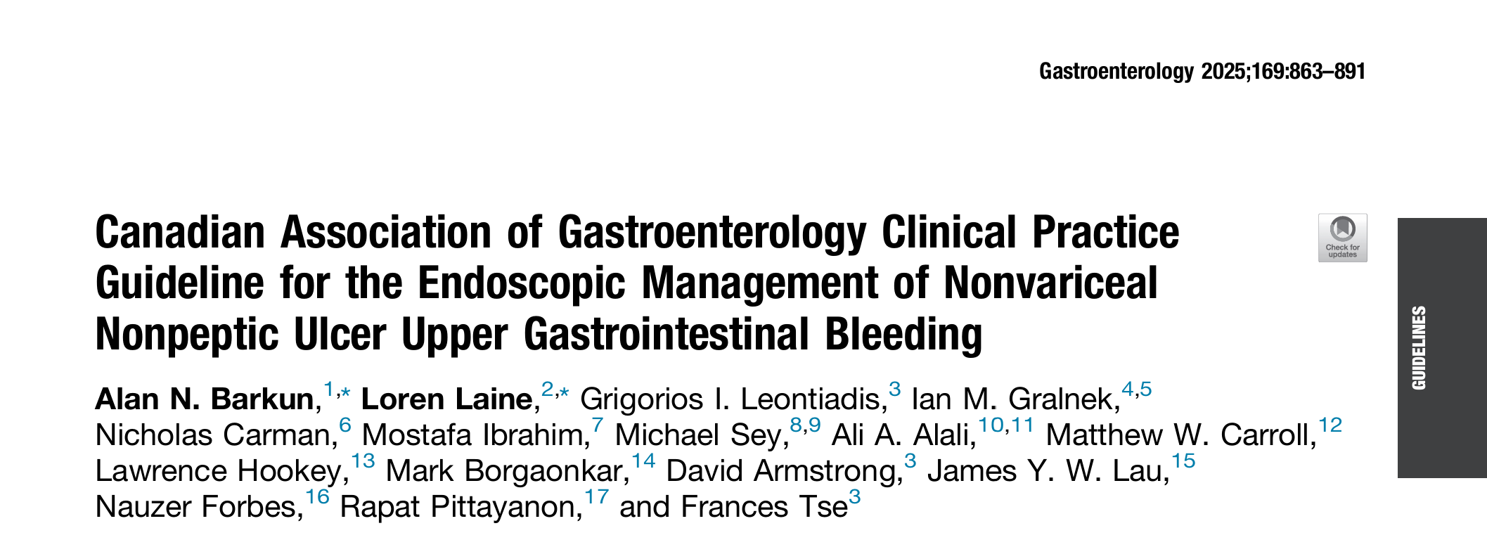 Barkun AN, Laine L, Leontiadis GI, Gralnek IM, Carman N, Ibrahim M, Sey M, Alali AA, Carroll MW, Hookey L, Borgaonkar M, Armstrong D, Lau JYW, Forbes N, Pittayanon R, Tse F. Canadian Association of Gastroenterology Clinical Practice Guideline for the Endoscopic Management of Nonvariceal Nonpeptic Ulcer Upper Gastrointestinal Bleeding. Gastroenterology. 2025;169(5):864-891.
