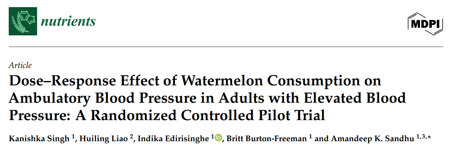 Singh, K.; Liao, H.; Edirisinghe, I.; Burton-Freeman, B.; Sandhu, A.K. Dose–Response Effect of Watermelon Consumption on Ambulatory Blood Pressure in Adults with Elevated Blood Pressure: A Randomized Controlled Pilot Trial. Nutrients 2025, 17, 3073. https://doi.org/10.3390/nu17193073