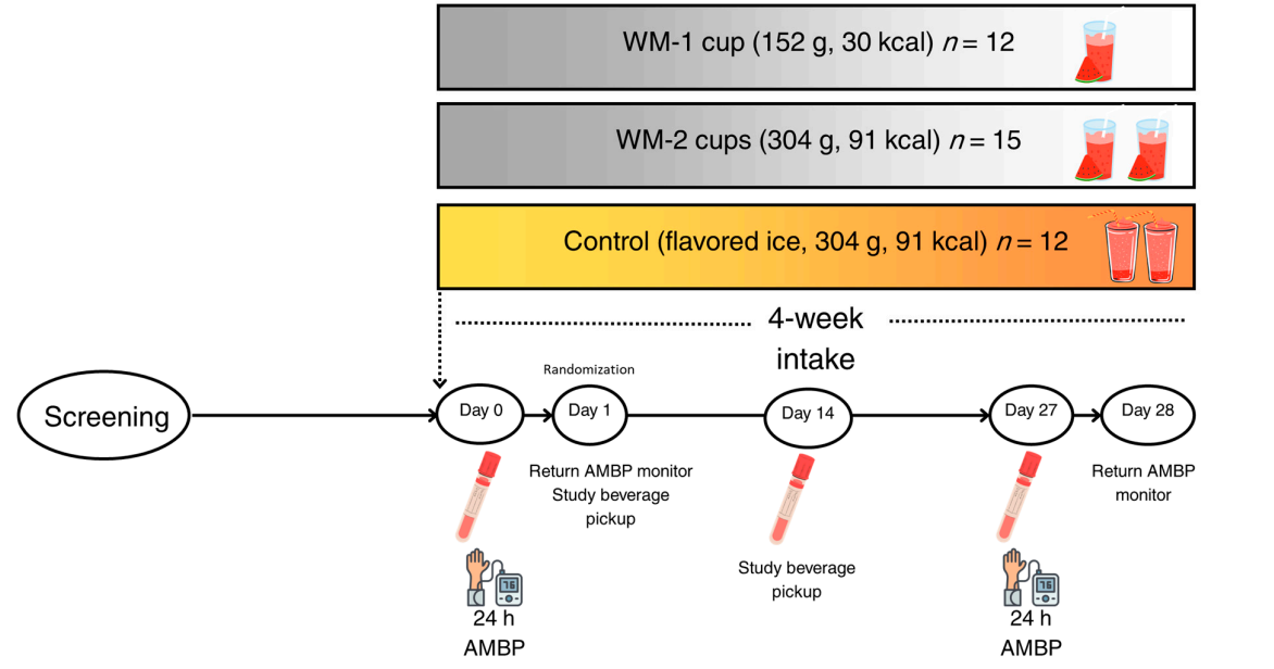 本研究为随机、单盲、安慰剂对照的平行设计试验,招募了39名年龄25至60岁,体质指数(BMI)约31 kg/m²,具有升高血压(收缩压120-139 mmHg,或舒张压80-89 mmHg)的非吸烟成人。参与者被随机分为三组,分别每日摄入0克(对照)、152克(1杯西瓜)或304克(2杯西瓜)西瓜果肉,干预期为4周。24小时动态血压通过自动监测器测量,采集基线及干预结束时的数据。空腹血浆样本用于分析葡萄糖、胰岛素、脂质谱(总胆固醇、甘油三酯、高密度及低密度脂蛋白胆固醇)、L-瓜氨酸、L-精氨酸、ADMA和NO浓度。