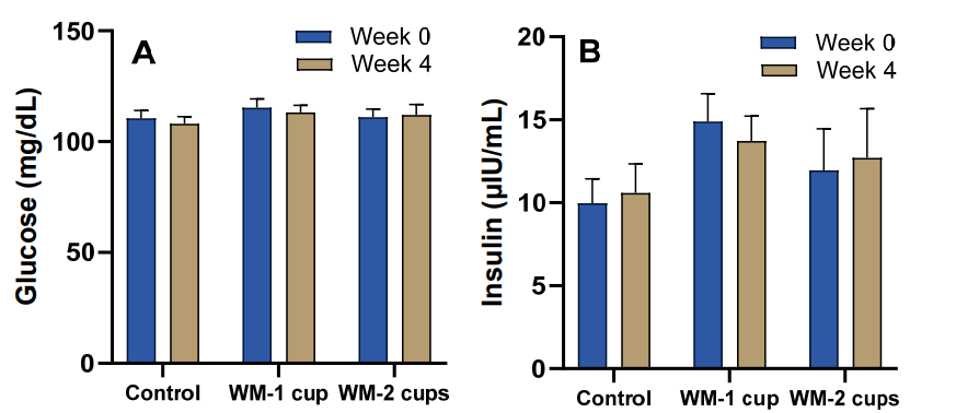 图:在连续4周每天饮用不同剂量西瓜饮料后,空腹血浆葡萄糖和胰岛素浓度的变化
