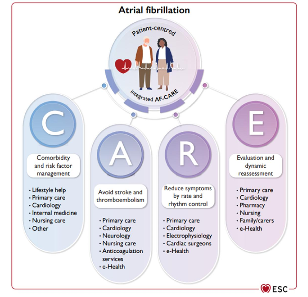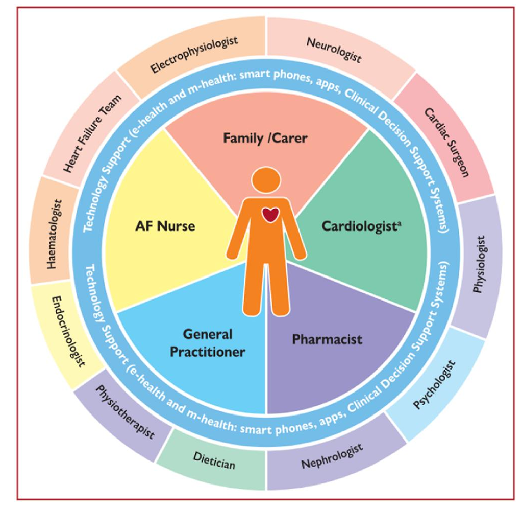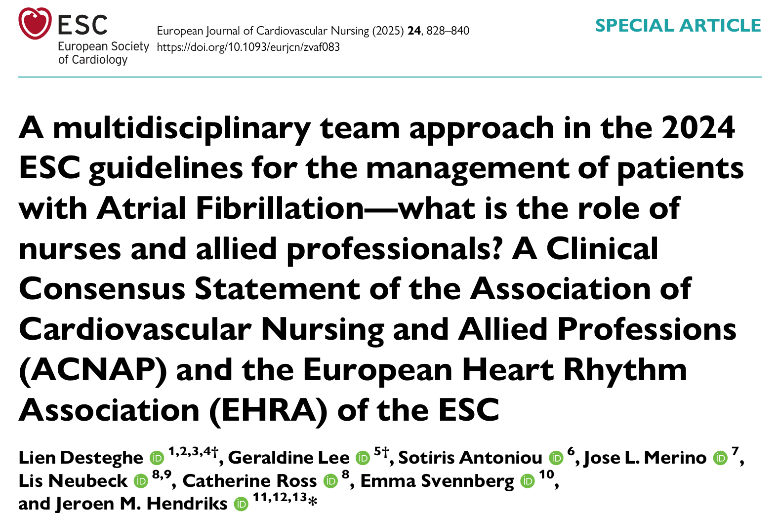 Desteghe L, Lee G, Antoniou S, Merino JL, Neubeck L, Ross C, Svennberg E, Hendriks JM. A multidisciplinary team approach in the 2024 ESC guidelines for the management of patients with Atrial Fibrillation—what is the role of nurses and allied professionals? A Clinical Consensus Statement of the Association of Cardiovascular Nursing and Allied Professions (ACNAP) and the European Heart Rhythm Association (EHRA) of the ESC. European Journal of Cardiovascular Nursing. 2025;24(8):828-840.