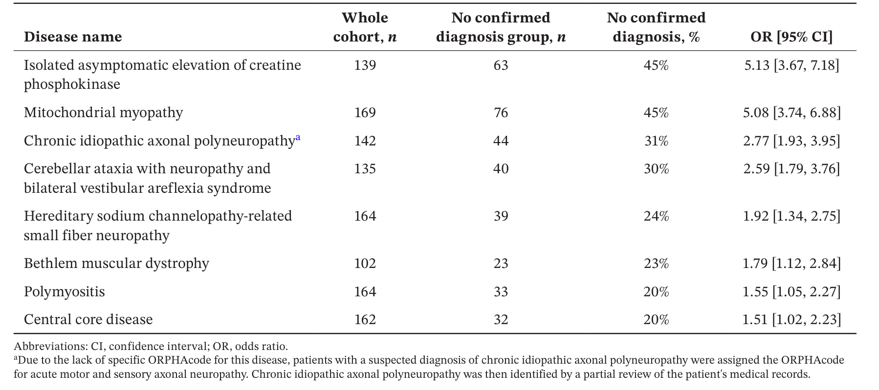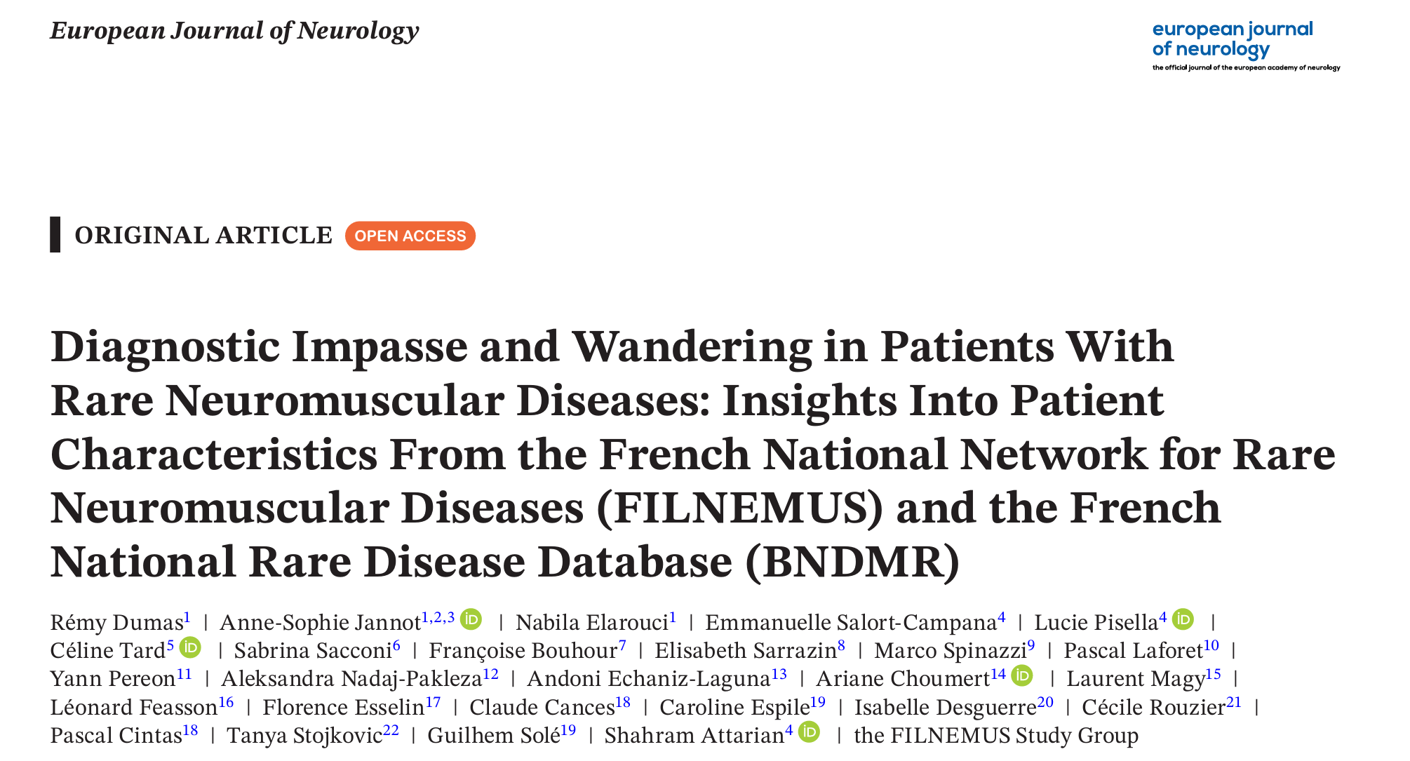 Dumas, R., Jannot, A.-S., Elarouci, N., Salort-Campana, E., Pisella, L., Tard, C., Sacconi, S., Boubour, F., Sarrazin, E., Spinazzi, M., Laforet, P., Percon, Y., Nadaj-Pakleza, A., Echaniz-Laguna, A., Choumert, A., Magy, L., Peasson, L., Esselin, F., Cances, C., … Attarian, S., & the FILNEMUS Study Group. (2025). Diagnostic Impasse and Wandering in Patients With Rare Neuromuscular Diseases: Insights Into Patient Characteristics From the French National Network for Rare Neuromuscular Diseases (FILNEMUS) and the French National Rare Disease Database (BNDMR). *European Journal of Neurology*, *32*, e70347. https://doi.org/10.1111/ene.70347
