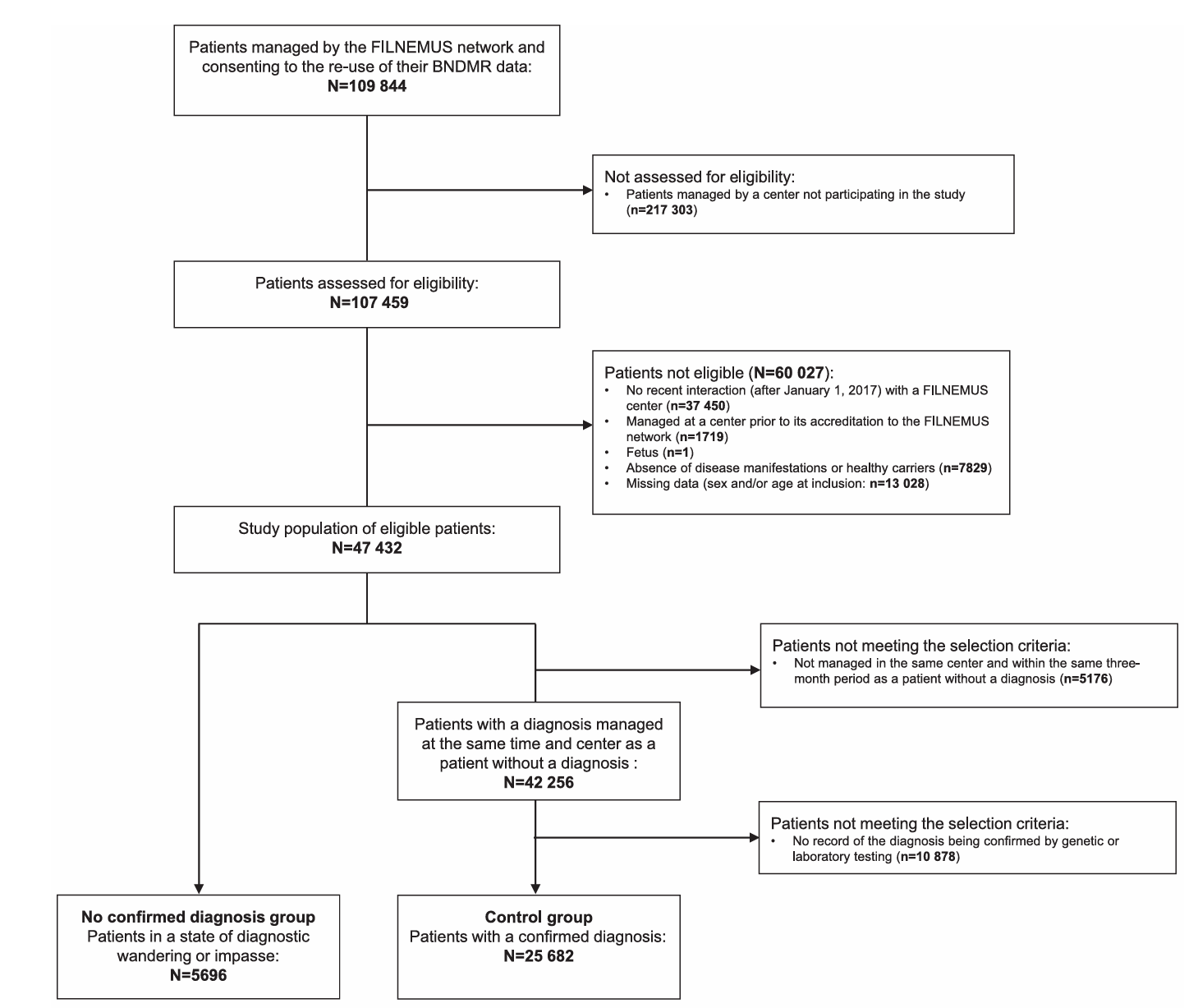 本研究是一项回顾性、多中心、队列研究,基于2022年11月15日之前收集的国家罕见疾病数据库最小数据集,纳居住在法国并在2017年1月之后在FILNEMUS网络中心接受治疗和随访的患者。收集的数据包括使用BaMaRa数据库常规收集的最小数据集(出生日期、性别、居住地址、诊断、咨询类型等)并从国家罕见疾病数据库中提取,以及为没有诊断的患者收集的额外数据(疾病表型、症状严重程度、诊断检查历史等)。国家罕见疾病数据库中的患者通过一个独特、永久且不可逆的标识符进行识别,这使得可以识别在不同中心随访的个体患者并聚合他们的多医院记录,同时保护他们的隐私,对于在多个中心管理的患者收集的数据中的差异,通过保留最早的日期、最小的年龄以及患者最常访问的医院最近的居住地址来解决。