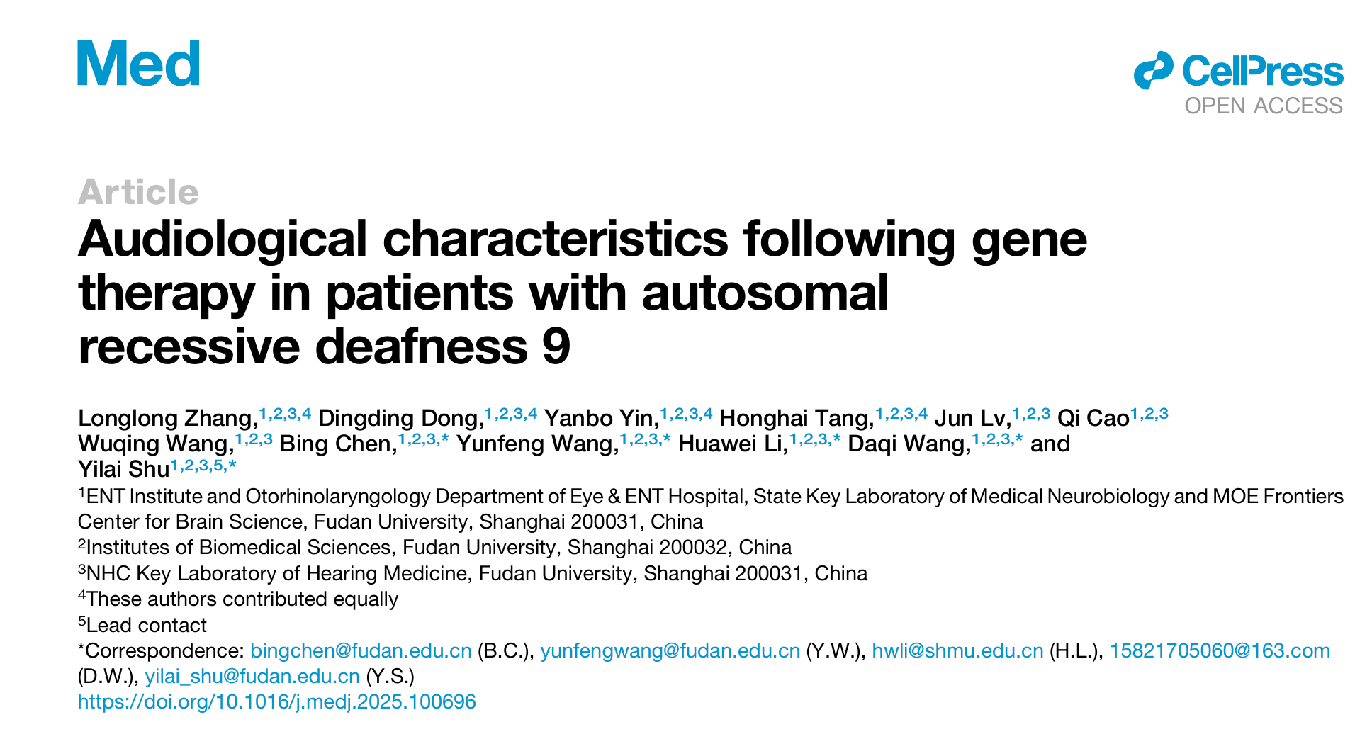 Zhang, L., Dong, D., Yin, Y., Tang, H., Lv, J., Cao, Q., Wang, W., Chen, B., Wang, Y., Li, H., Wang, D., & Shu, Y. (2025). Audiological characteristics following gene therapy in patients with autosomal recessive deafness 9. Med, 6, 100696. https://doi.org/10.1016/j.medj.2025.100696