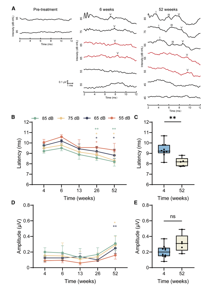 结果显示,基因治疗后患者听觉功能逐步恢复。至13周时,所有10名患者均可在ABR中识别出波V,且随着时间推移,波V潜伏期显著缩短,振幅呈上升趋势。以1 kHz频率为例,在85 dB nHL刺激下,波V潜伏期从治疗4周时的9.220 ms(范围9.015–9.810 ms)缩短至52周时的8.190 ms(范围7.780–8.530 ms),差异具有统计学意义(p=0.004)。波V振幅虽未达到显著差异(4周为0.200 μV,52周为0.310 μV,p=0.055),但整体呈上升趋势。在部分患者中,治疗后还可观察到波I和波III的出现,波I在13周时检出率为6.7%,最终随访时增至13.3%;波III在6周时检出率为6.7%,26周时达到60.0%,提示听觉通路逐渐恢复同步化活动。除1 kHz外,0.5、2和4 kHz频率也表现出类似的潜伏期缩短和振幅增加趋势。