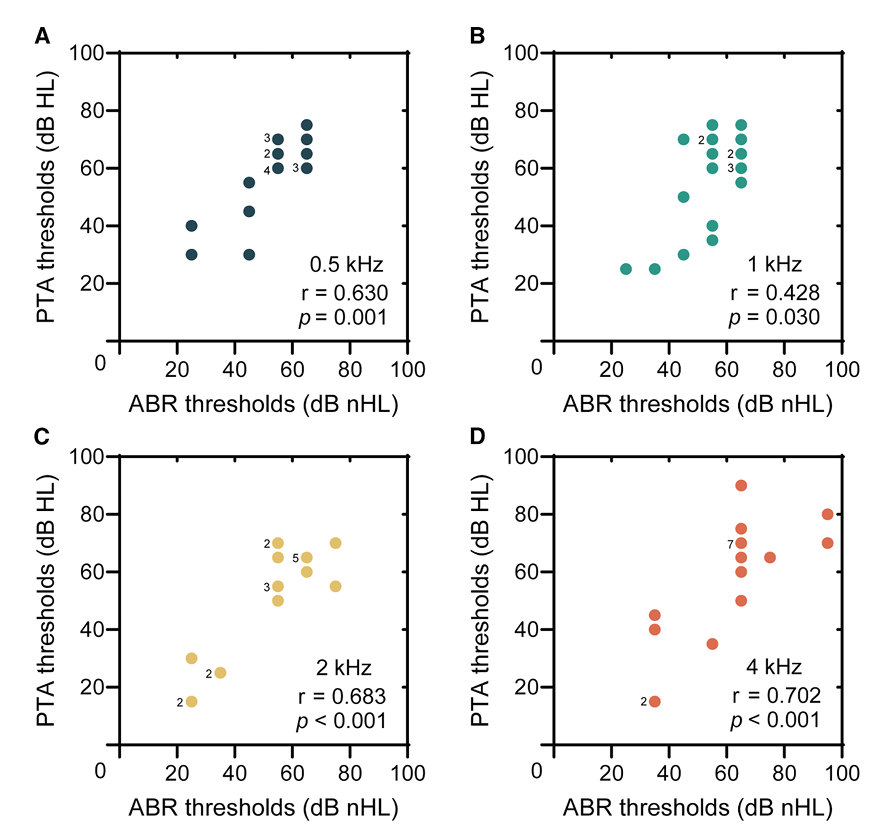 PTA、ABR和ASSR阈值之间显示出显著的正相关关系。由于患儿年龄小、配合差,仅4名患者(5耳)能完成PTA测试。Spearman相关分析表明,在0.5、1、2和4 kHz频率下,PTA与ABR阈值的相关系数分别为0.630、0.428、0.683和0.702(p值均<0.05),PTA与ASSR阈值的相关系数分别为0.760、0.466、0.810和0.754(p值均<0.05)。ABR与ASSR阈值之间也存在显著正相关,相关系数在0.5–4 kHz范围内介于0.509–0.702之间(p<0.001)。这一结果证实了ABR和ASSR可作为评估基因治疗后听力恢复的可靠客观工具,尤其适用于无法配合行为测听的儿童患者。
