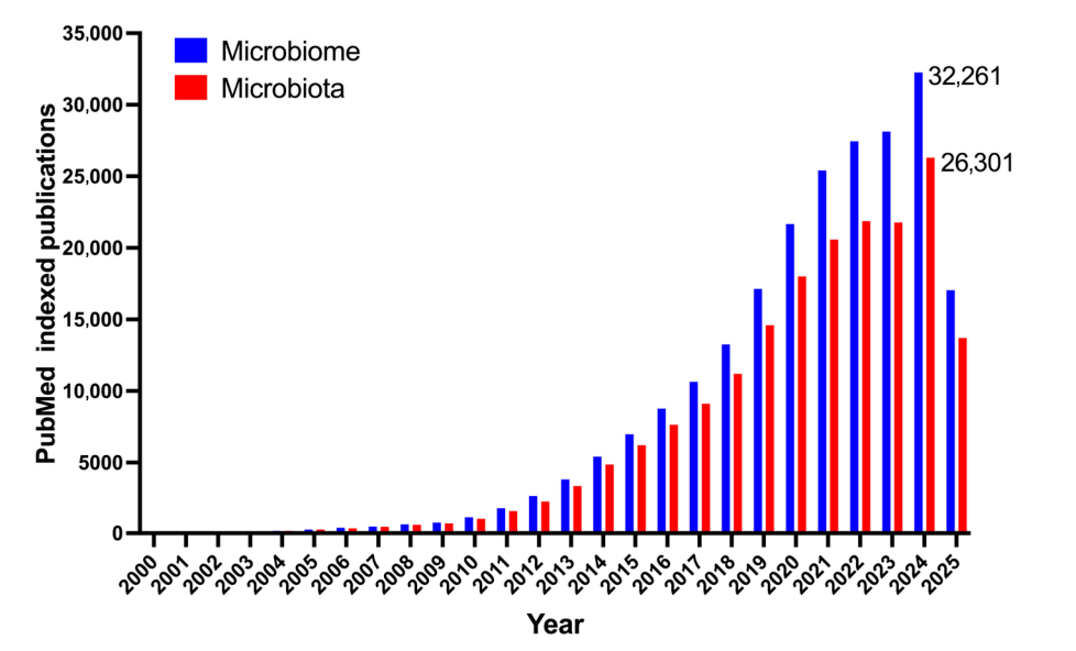图:每年PubMed收录的包含关键词“microbiome”和“microbiota”的文章数量统计
