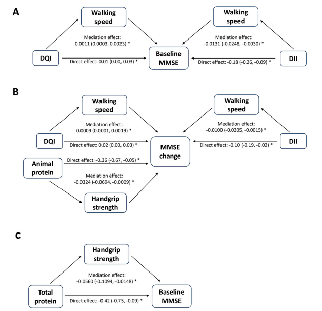 此外,这些饮食模式的保护效应在肌少症及重度肌少症患者中更为显著。 性别差异方面,DASH饮食和DII对女性的保护作用更强,MIND饮食则在男性肌少症患者中与认知分数提升相关。 最后,中介分析发现握力和行走速度是饮食影响认知效果的重要中介变量,提示饮食通过改善肌肉力量和身体机能间接促进认知健康。