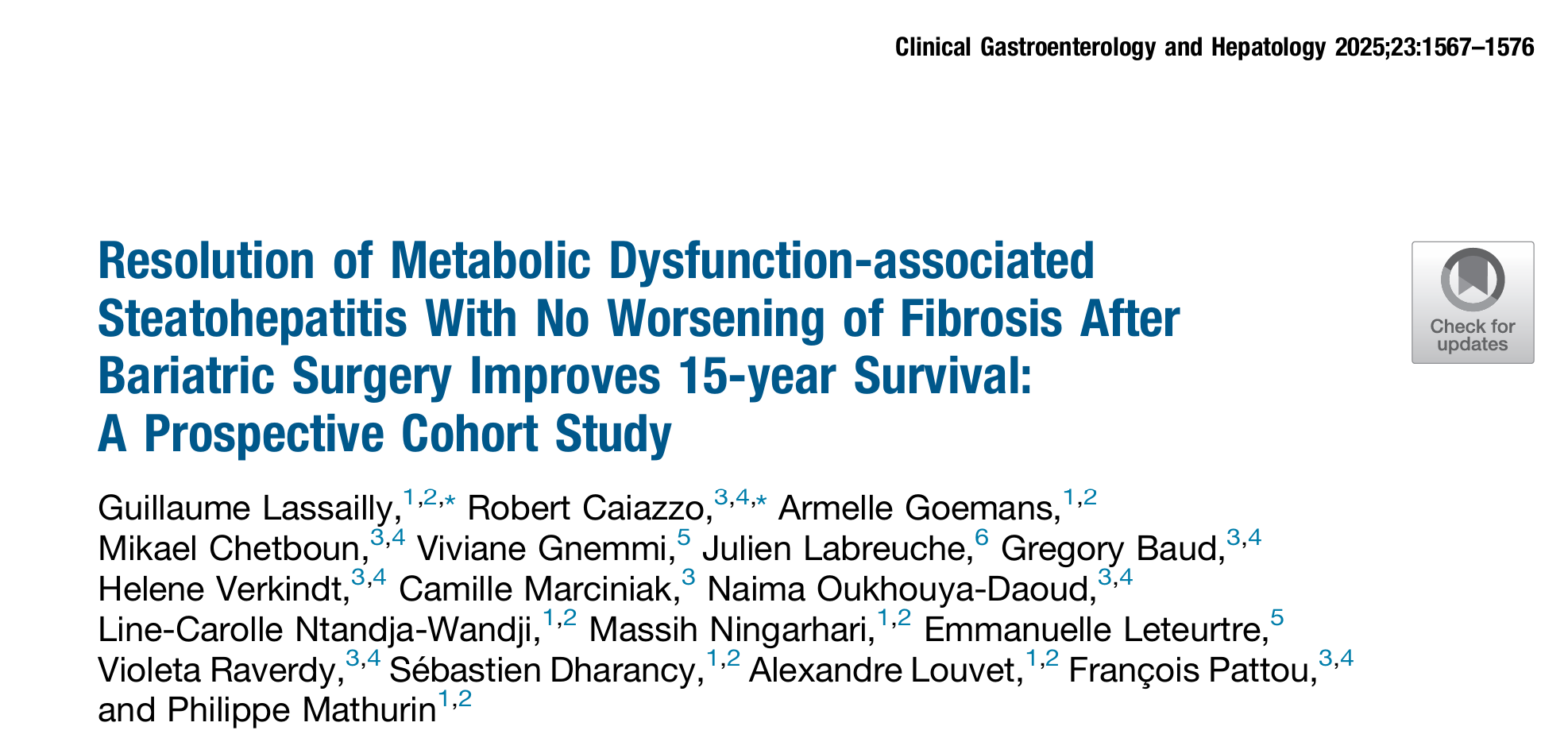 Lassailly G, Caiazzo R, Goemans A, Chetboun M, Gnemmi V, Labreuche J, Baud G, Verkindt H, Marciniak C, Oukhouya-Daoud N, Ntandja-Wandji LC, Ningarhari M, Leteurtre E, Raverdy V, Dharancy S, Louvet A, Pattou F, Mathurin P. Resolution of Metabolic Dysfunction-associated Steatohepatitis With No Worsening of Fibrosis After Bariatric Surgery Improves 15-year Survival: A Prospective Cohort Study. Clin Gastroenterol Hepatol. 2025;23(9):1567-1576.