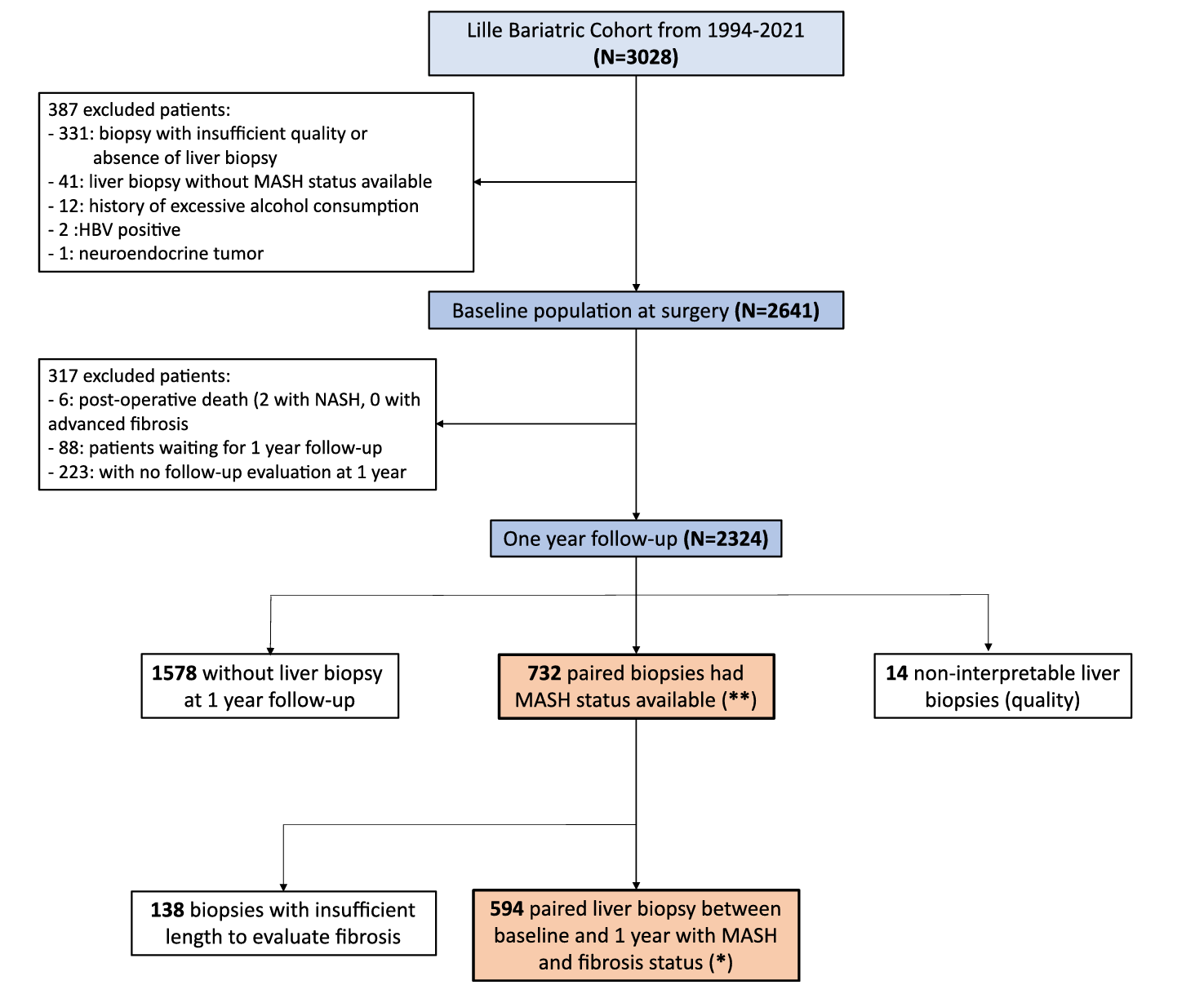 本研究基于法国里尔大学医院自1994年启动的里尔减重手术前瞻性队列,持续纳入接受初次减重手术的成年患者,所有患者在手术前均签署知情同意书并接受全面的表型评估。研究遵循赫尔辛基宣言并获得伦理委员会批准,在1994年至2021年期间共纳入3028例患者,其中2641例在基线时进行了质量合格的肝活检并构成主要分析人群,根据医院病理政策演变,术后一年肝活检最初推荐给所有患者,2010年后调整为优先针对基线存在脂肪性肝炎或显著纤维化的患者进行随访活检,最终有594例患者拥有基线和术后一年配对的脂肪性肝炎与纤维化组织学数据,用于分析组织学动态变化与生存结局的关联。手术方式随时间推移而多样化,包括胃旁路术、胃束带术和袖状胃切除术等,所有患者术前均接受多学科评估和营养干预,术后进行规律随访,肝活检标本由经验丰富的病理医师采用盲法评估,依据非酒精性脂肪性肝炎临床研究网络指南和Brunt评分系统对脂肪变性、小叶炎症、肝细胞气球样变和纤维化程度进行标准化分级,纤维化分为F0至F4期,其中F2至F4被视为显著纤维化,脂肪性肝炎的诊断则基于组织学活动度评分和专家判读。