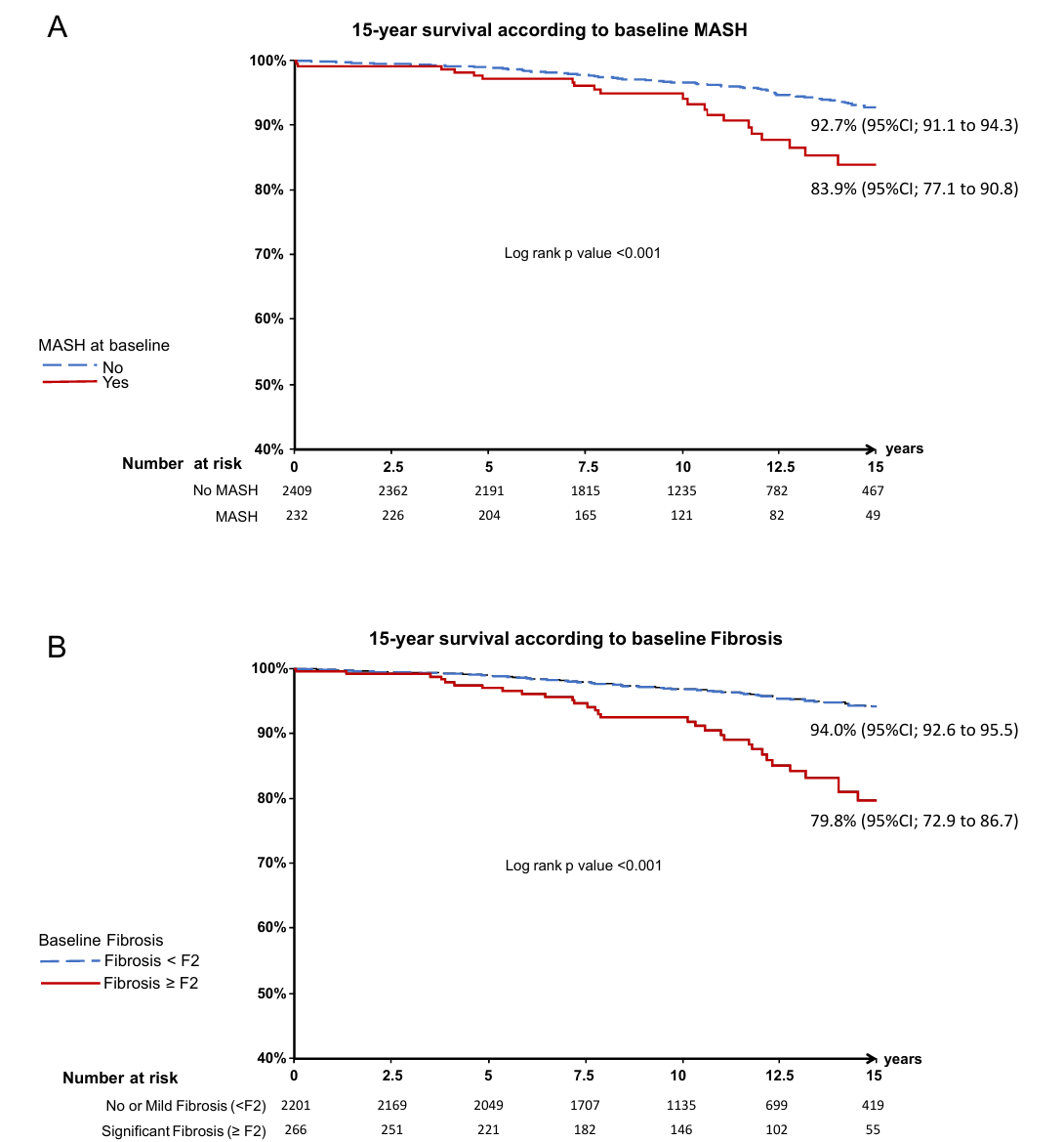 在2641例基线有肝活检的患者中,中位随访时间为10.1年,基线时8.8%的患者诊断为脂肪性肝炎,10.8%存在显著纤维化(F2–F4),这些患者的临床特征显示其代谢负担更重,糖尿病、高血压和血脂异常患病率更高,肝脏酶学和糖化血红蛋白水平也显著升高。生存分析明确显示基线脂肪性肝炎和显著纤维化均与较差的长期预后相关,十五年生存率在脂肪性肝炎患者中为83.9%,而无脂肪性肝炎者为92.7%,风险比为2.21,在显著纤维化患者中生存率进一步降至79.8%,而无显著纤维化者达94.0%,风险比高达3.38,这表明基线肝组织学状态是影响减重手术患者长期生存的重要独立预测因素。