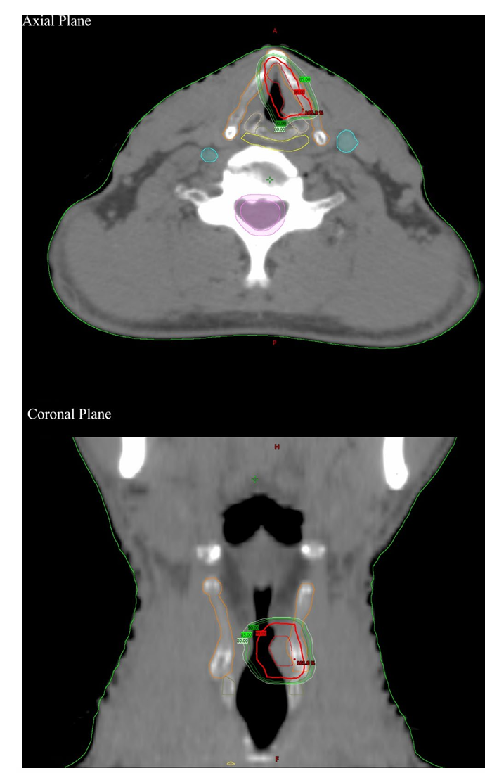 综上所述,超低分割放疗在早期声门癌患者中显示出良好的局部控制效果和喉功能保留潜力,尤其适用于无法接受常规治疗的人群。然而,治疗过程中需严格把控靶区剂量,特别是PTV D98应避免超过41.08 Gy,以降低放射性坏死风险。此外,治疗后随访和管理需要多学科团队协作,包括放射肿瘤科、头颈外科、病理科等专业人员的密切配合。未来仍需更多前瞻性随机研究,比较全喉照射与单声带超低分割放疗的疗效与安全性,以进一步明确其在早期声门癌治疗中的标准和地位。