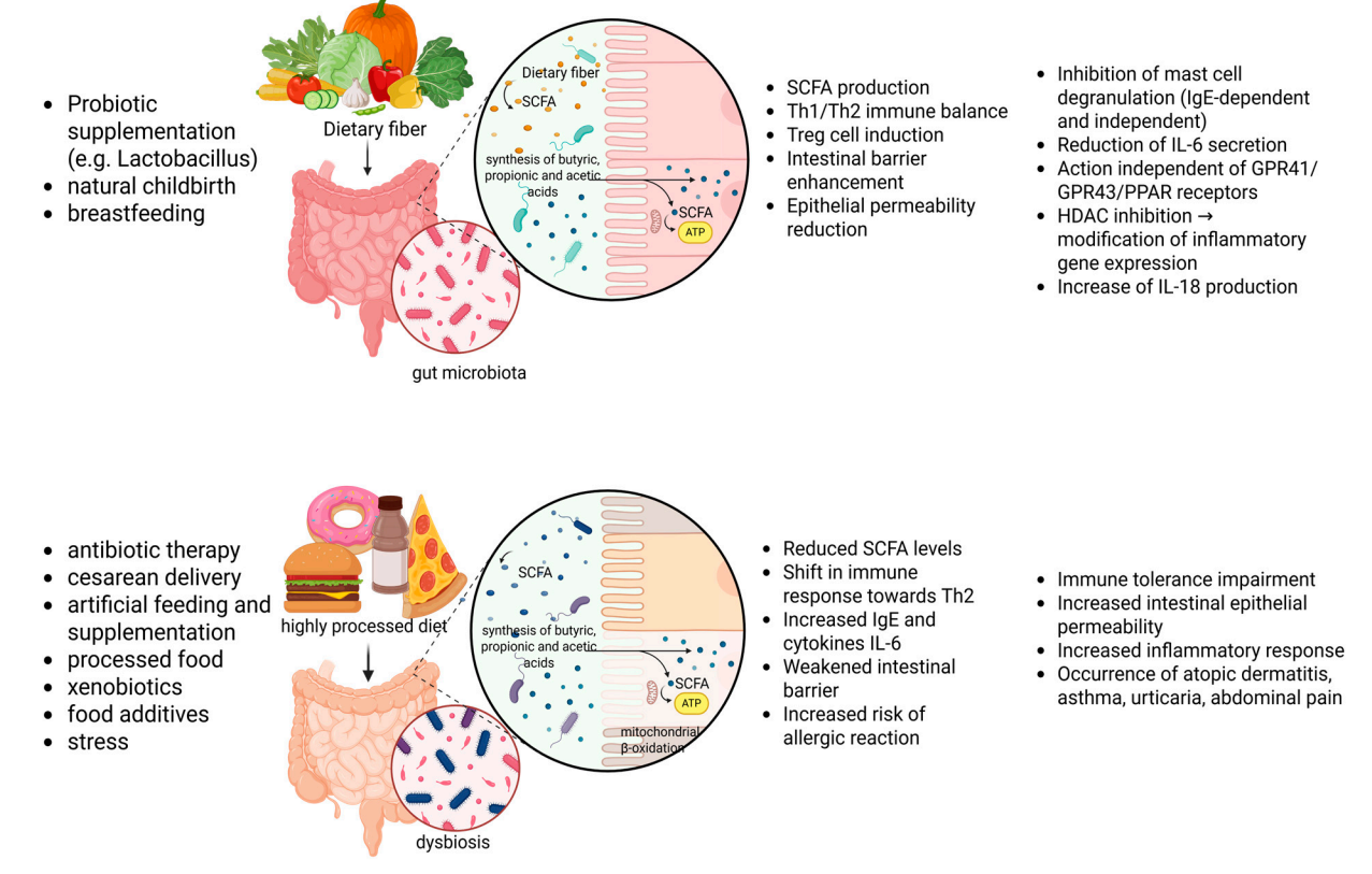 早期生活方式包括自然分娩、母乳喂养及生活在农村环境中,均与较高的SCFAs水平相关,这些因素有助于丰富肠道菌群,降低过敏风险。动物模型研究显示,补充益生元(如短长链果寡糖)和益生菌(如Bifidobacterium breve)能增加肠道SCFAs水平,减轻食物过敏反应。
