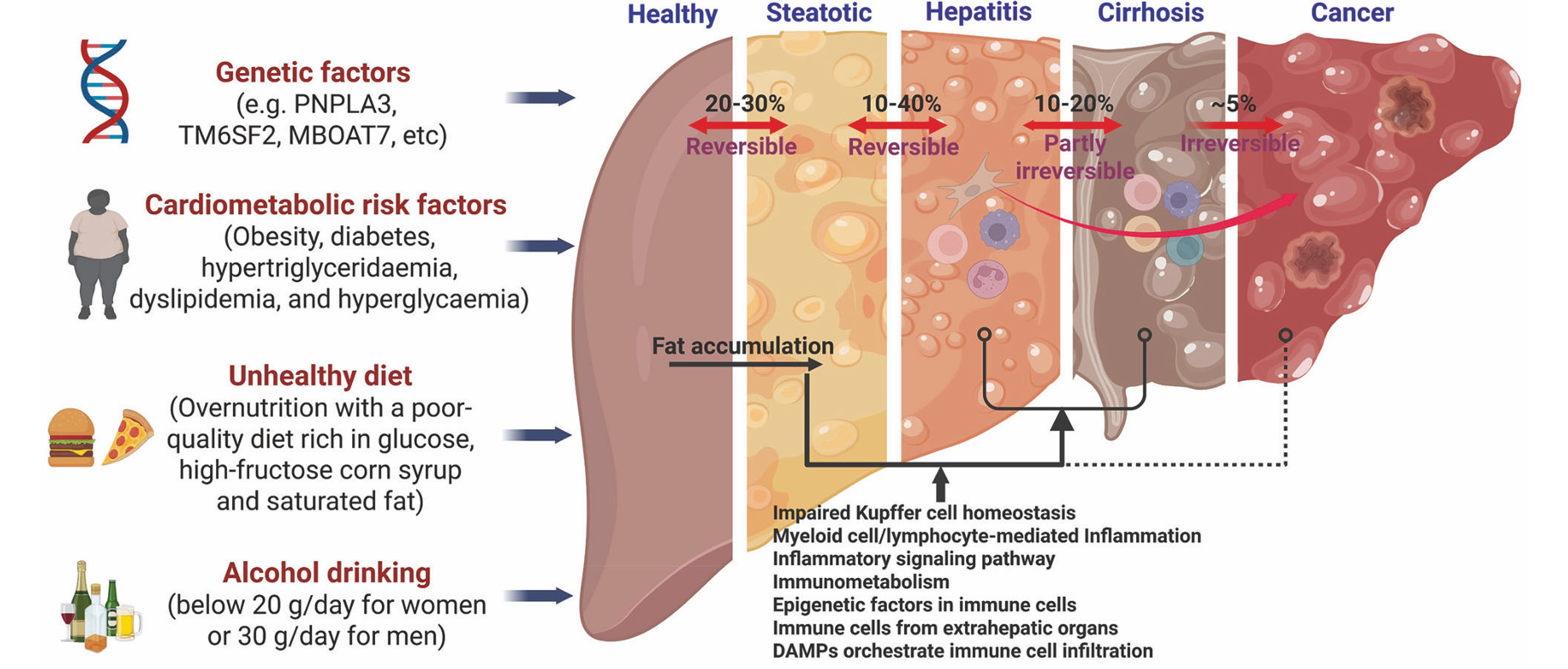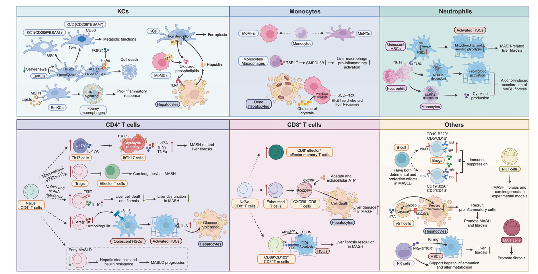 代谢功能障碍相关脂肪性肝病(MASLD)是全球范围内最为常见的慢性肝脏疾病,其患病率高达约30%,疾病谱系从单纯的肝脏脂肪变性逐步进展为代谢功能障碍相关脂肪性肝炎(MASH),并可能进一步发展为肝纤维化、肝硬化乃至肝细胞癌,这一过程给全球公共卫生系统带来了沉重的负担。MASLD的发病机制极为复杂,涉及慢性营养过剩、遗传易感性因素以及多种致病后果,其中肝脏炎症被认为是驱动单纯脂肪变性向脂肪性肝炎转变的关键事件。尽管近年来在MASLD的代谢异常机制研究方面取得了显著进展,但直接针对炎症过程的有效药物治疗仍然有限,因此深入探索其免疫病理机制并开发相应的免疫调节疗法显得尤为重要。