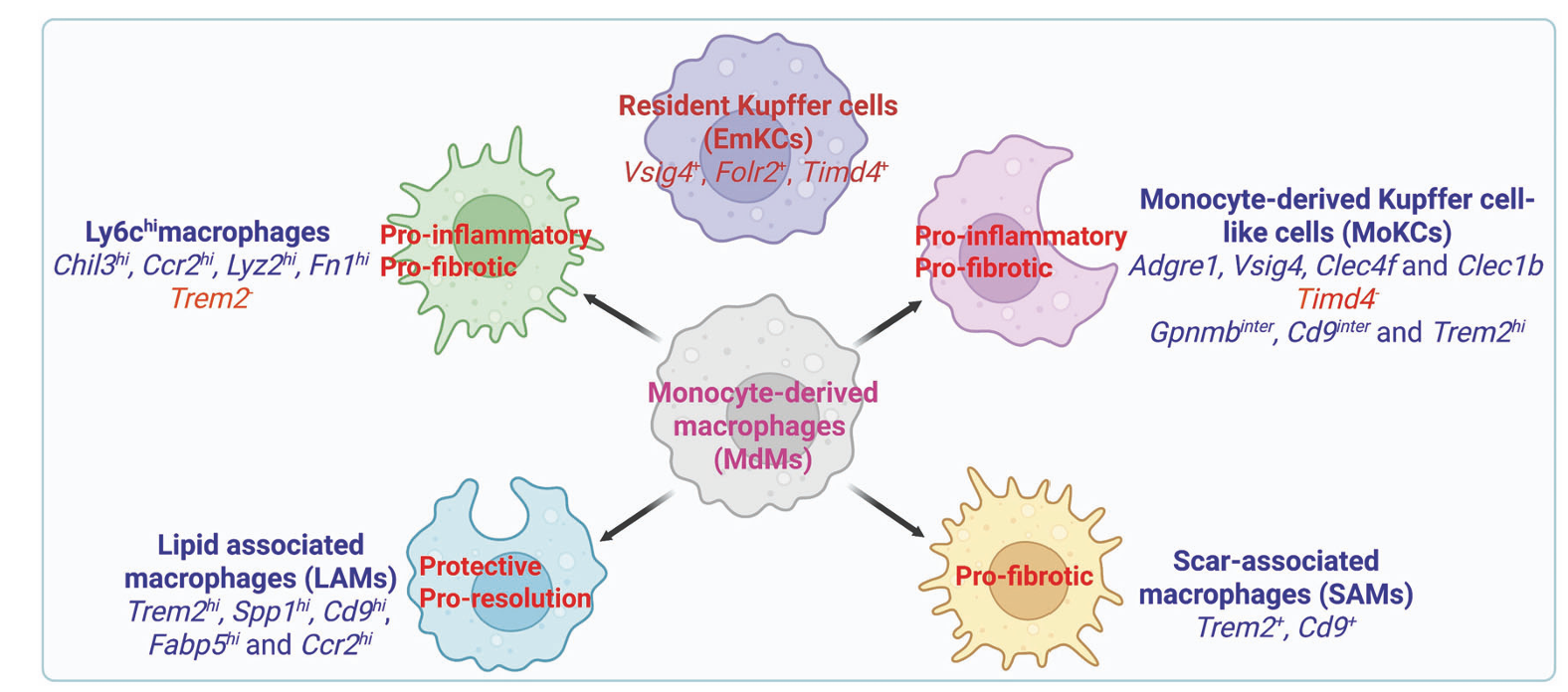 在MASLD的免疫机制中,肝脏巨噬细胞扮演了核心角色,其群体构成和功能状态在疾病进程中发生显著变化。健康肝脏中绝大多数为胚胎来源的Kupffer细胞(EmKCs),但在MASLD发展过程中,这些驻留巨噬细胞数量减少,逐渐被骨髓来源的单核细胞衍生的巨噬细胞(MdMs)所替代。单细胞转录组分析揭示了MdMs在MASH肝脏中可进一步分为多个功能亚群,包括具有促炎和促纤维化特性的Ly6C高表达招募巨噬细胞、占据Kupffer细胞生态位的单核来源Kupffer样细胞(MoKCs)以及脂质相关巨噬细胞(LAMs)。LAMs特征性表达TREM2、SPP1、CD9等分子,它们在清除凋亡细胞、调节脂质代谢以及促进组织修复方面发挥重要作用,尤其是在疾病回归过程中,TREM2+ LAMs被证实是驱动纤维化消退的关键细胞群体。TREM2的功能研究显示,其在巨噬细胞介导的胞葬作用中至关重要,而MASLD状态下TREM2的脱落会导致胞葬功能受损,从而加剧慢性炎症。此外,循环中可溶性TREM2(sTrem2)水平与MASLD疾病活动度相关,显示出作为无创生物标志物的潜力。除了TREM2+巨噬细胞,其他如Basp1+髓系细胞和MS4A7+巨噬细胞也被发现通过调节炎症小体激活等机制参与MASLD的发病。