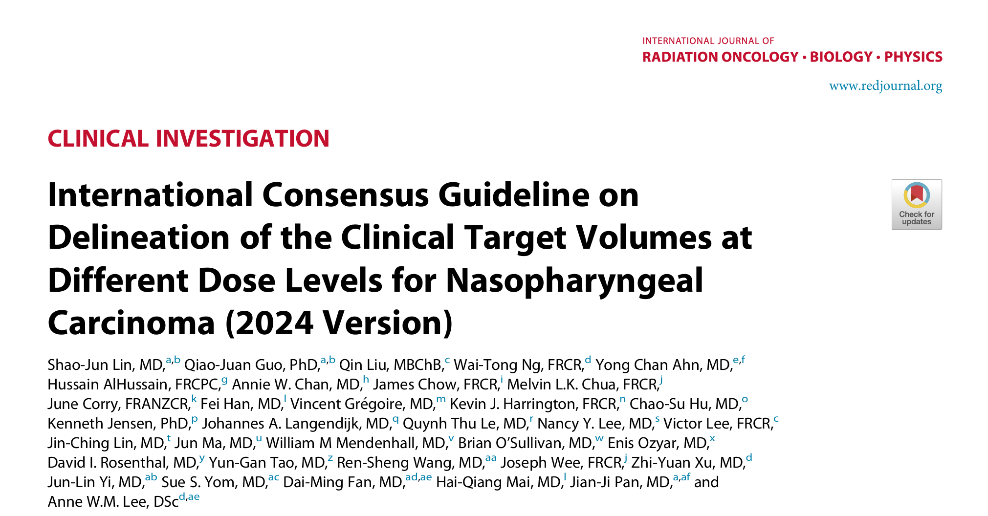 Lin SJ, Guo QJ, Liu Q, Ng WT, Ahn YC, AlHussain H, Chan AW, Chow J, Chua MLK, Corry J, Han F, Grégoire V, Harrington KJ, Hu CS, Jensen K, Langendijk JA, Le QT, Lee NY, Lee V, Lin JC, Ma J, Mendenhall WM, O'Sullivan B, Ozyar E, Rosenthal DI, Tao YG, Wang RS, Wee J, Xu ZY, Yi JL, Yom SS, Fan DM, Mai HQ, Pan JJ, Lee AWM. International Consensus Guideline on Delineation of the Clinical Target Volumes at Different Dose Levels for Nasopharyngeal Carcinoma (2024 Version). Int J Radiation Oncol Biol Phys. 2025;123(2):415-431.