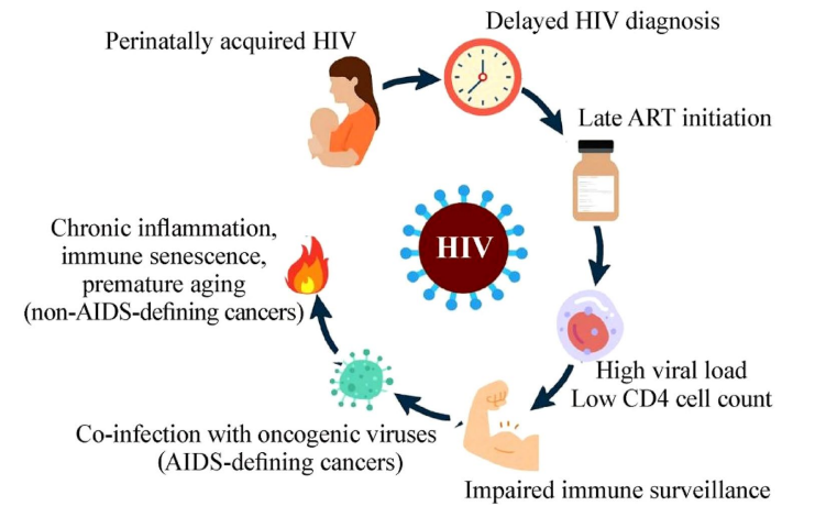 截至2023年底,全球约有4000万人感染人类免疫缺陷病毒(HIV),其中包括140万15岁以下儿童。全球数据显示,0-9岁儿童HIV新发感染数显著下降,艾滋病(AIDS)相关死亡率自2002年高峰以来减少了75%。因此,越来越多的儿童HIV感染者已步入青少年及成年阶段。 早期获得性HIV感染的儿童、青少年及年轻成人(CAYA-LEAHIV)面临较高癌症风险,原因包括免疫系统受损以及易感染致癌病毒如Epstein–Barr病毒(EBV)、人类疱疹病毒8型(HHV-8)和人乳头瘤病毒等。此外,HIV病毒本身通过病毒蛋白的致癌潜力、慢性免疫激活和免疫衰老等机制促进癌症发生,抗逆转录病毒治疗(ART)相关毒性亦可能成为致癌因素之一。