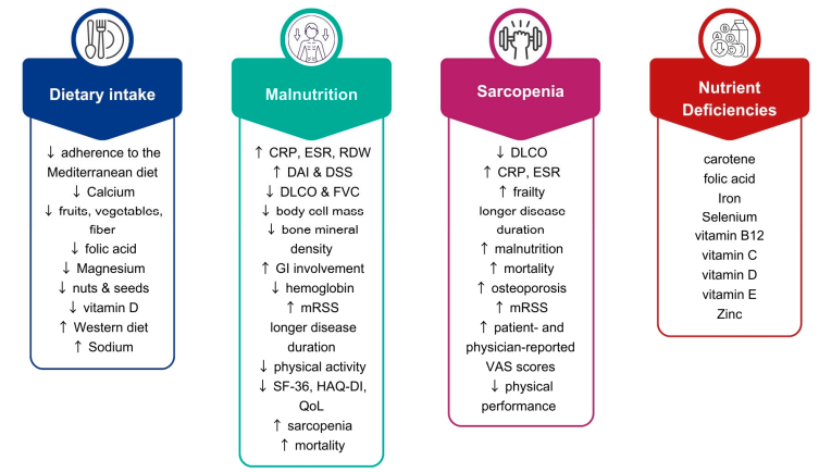 GI受累严重影响患者的饮食习惯,许多患者因吞咽困难和早饱等症状减少进食次数和量。尽管营养重要,SSc患者普遍摄入不足,尤其是水果、蔬菜和膳食纤维。伴有GERD的患者脂肪摄入增加,而吞咽障碍患者偏好甜食和零食。微量元素如维生素D、叶酸、钙、镁和铁摄入不足较为常见。大部分患者饮食模式偏向西式高钠饮食,地中海饮食(MedDiet)依从性较差,且饮食不良与抑郁、症状加重相关。多数患者表现出愿意接受营养指导。