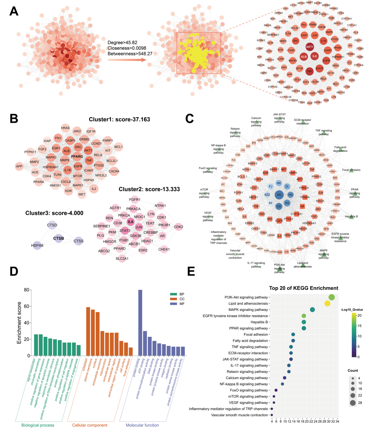 本研究采用CCl4诱导小鼠肝硬化模型,实施肉苁蓉颗粒干预。通过影像技术评估肝脏弹性与血流速度,检测血清肝功能指标ALT、AST及透明质酸(HA)水平。肝组织病理学分析结合免疫组化染色,观察HSC激活标志物α-SMA及血管生成指标VEGF、CD34表达变化。扫描电镜用于评估LSEC滤孔结构。结合UPLC-Q-TOF-MS/MS鉴定活性成分,配合网络药理学分析,确定潜在靶点。转录组与单细胞测序揭示关键通路,利用西方印迹(WB)、免疫荧光以及分子对接技术验证机制。