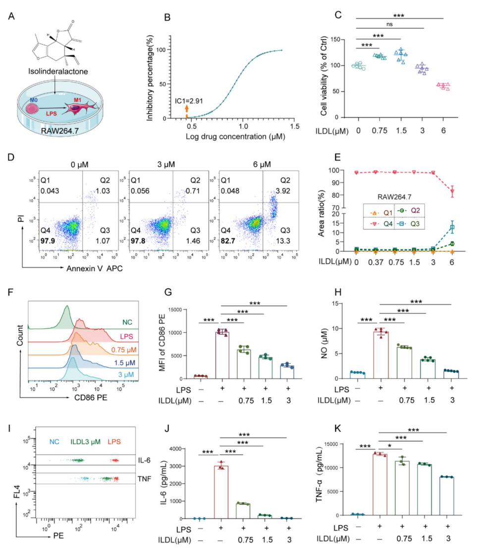 为了系统评估ILDL的抗炎效应,研究首先采用LPS诱导的RAW264.7巨噬细胞炎症模型,筛选沉香中活性组分的抗炎效果。随后,选用经典的DSS诱导急性溃疡性结肠炎小鼠模型,深入观察ILDL在体内的保护作用和改善肠道病理表现的能力。
