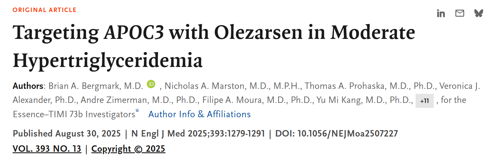Bergmark BA, Marston NA, Prohaska TA, et al. Targeting APOC3 with Olezarsen in Moderate Hypertriglyceridemia. N Engl J Med. 2025;393(13):1279-1291. doi:10.1056/NEJMoa2507227