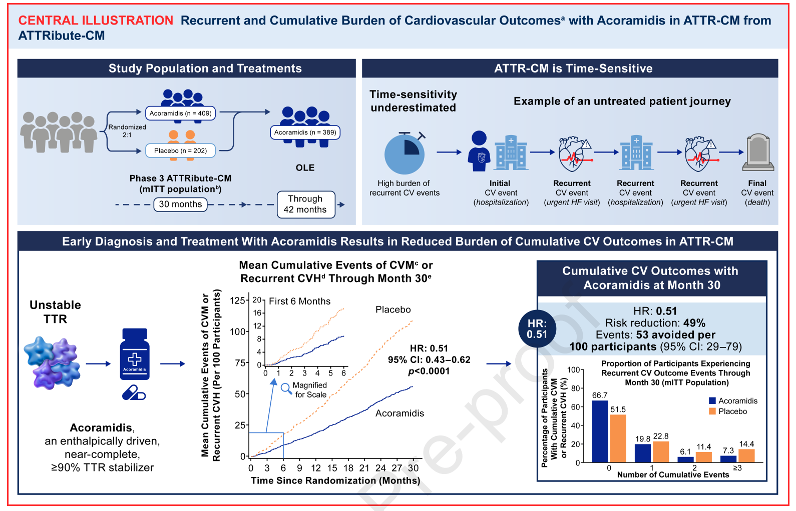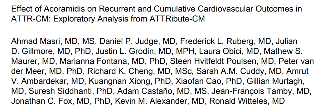 Masri, A, Judge, D, Ruberg, F. et al. Effect of Acoramidis on Recurrent and Cumulative Cardiovascular Outcomes in ATTR-CM: Exploratory Analysis from ATTRibute-CM. JACC. null2025, 0 (0) .https://doi.org/10.1016/j.jacc.2025.09.013