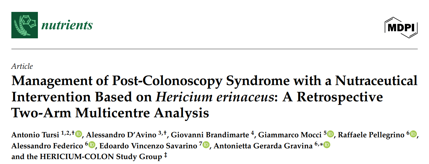 Tursi, A.; D’Avino, A.; Brandimarte, G.; Mocci, G.; Pellegrino, R.; Federico, A.; Savarino, E.V.; Gravina, A.G.; the HERICIUM-COLON Study Group. Management of Post-Colonoscopy Syndrome with a Nutraceutical Intervention Based on Hericium erinaceus: A Retrospective Two-Arm Multicentre Analysis. Nutrients 2025, 17, 3152. https://doi.org/10.3390/nu17193152