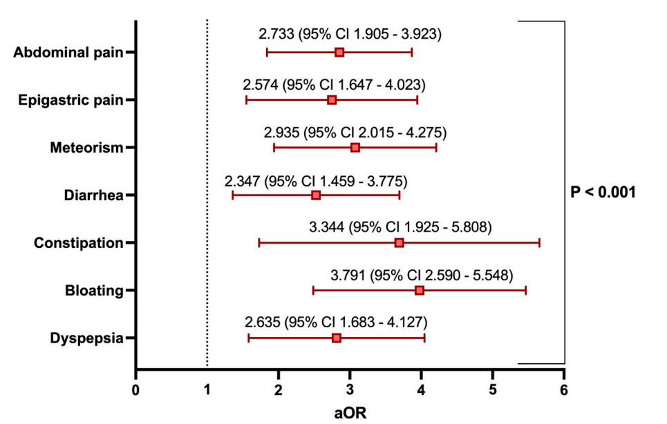 结果显示,共纳入599例患者,其中64.9%接受营养补充剂治疗。两组基线特征大致均衡。结果显示,营养补充剂组在腹痛(59.9% vs. 33.3%)、腹胀(59.3% vs. 26.7%)、胀气(64.9% vs. 35.1%)及腹泻(46.9% vs. 19.5%)等症状的改善率显著优于对照组(均P<0.001)。多变量逻辑回归分析显示,补充剂显著降低便秘(调整后OR=3.344)和腹胀(调整后OR=3.791)症状风险。VAS评分在补充剂组随访期间呈明显下降趋势,综合症状评分减轻比例也高于对照组。