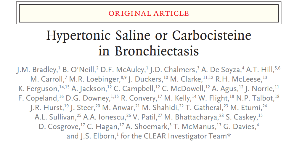 尽管超高渗盐水和羧甲司坦在理论上能够帮助改善痰液性质和促进排出,减少感染,但真实世界中未能显著降低肺部急性加重的发生率。这反映了支气管扩张症的病理复杂性,单一药物的介入可能难以改变疾病的自然进程。 从方法论角度看,试验设计合理,排除了潜在混杂因素,且患者样本涵盖临床常见的中重度病例,结果具有较好的代表性和推广价值。 在治疗策略上,目前标准护理(包括抗生素治疗、物理治疗等)仍是支气管扩张症患者管理的核心,黏液活性药物可能作为辅助,且需结合个体化治疗方案。