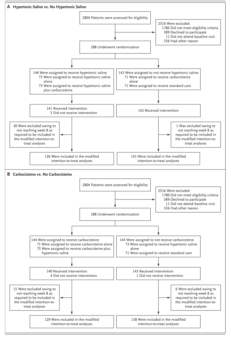 为了填补该领域的证据空白,一项在英国20个临床中心开展的开放标签、随机、2×2因子设计的试验被启动。研究纳入了具有非囊性纤维化支气管扩张症,且表现为频繁肺部急性加重和每日咳痰的患者。排除标准包括当前吸烟者和近期使用过黏液活性药物者,以避免混杂因素的影响。 参与者均接受标准护理,并随机分配到以下四组之一:纯标准护理组、超高渗盐水组、羧甲司坦组以及超高渗盐水加羧甲司坦联合组。研究的主要比较是超高渗盐水与非超高渗盐水,以及羧甲司坦与非羧甲司坦之间的疗效差异。 研究的主要终点是52周内肺部急性加重的次数。次要终点包括疾病特异性健康相关生活质量评分、至下一次急性加重的时间以及安全性指标。