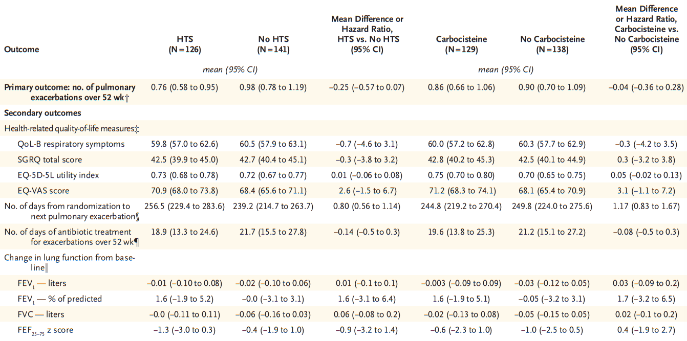 此次试验共纳入288名患者,结果显示不存在治疗间的交互作用,表明超高渗盐水和羧甲司坦各自的效应独立存在。 具体来看,接受超高渗盐水治疗的患者,52周内平均肺部急性加重次数为0.76次(95%置信区间0.58至0.95),而未接受超高渗盐水的患者为0.98次(95%CI,0.78至1.19)。经过调整,组间平均差为-0.25,P值为0.12,未达到统计学显著性。 羧甲司坦组患者的急性加重次数为0.86次(95%CI,0.66至1.06),与未用羧甲司坦组的0.90次(95%CI,0.70至1.09)无显著差别(调整后差值-0.04,P=0.81)。 此外,次要终点如生活质量评分及至下一次加重的时间也无显著改善。 安全性方面,四组间不良事件,包括严重不良事件的发生率相似,显示两种药物在本试验条件下均具有良好的耐受性。