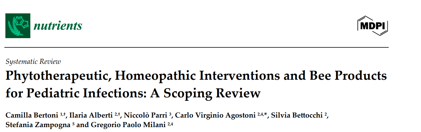 Bertoni, C.; Alberti, I.; Parri, N.; Agostoni, C.V.; Bettocchi, S.; Zampogna, S.; Milani, G.P. Phytotherapeutic, Homeopathic Interventions and Bee Products for Pediatric Infections: A Scoping Review. Nutrients 2025, 17, 3137. https://doi.org/10.3390/nu17193137