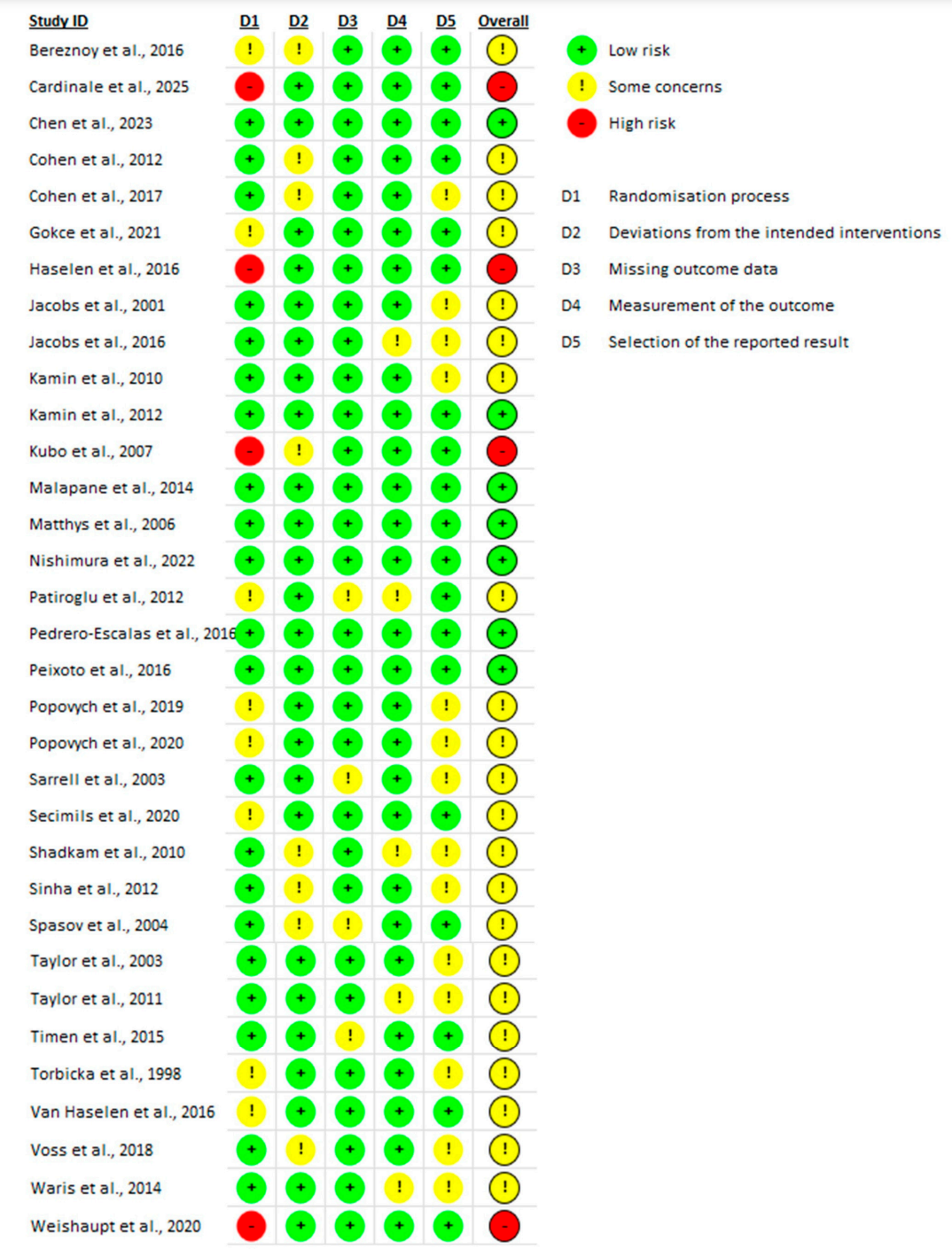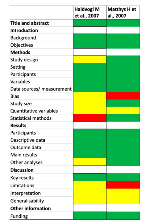 图:质量评估(观察性研究),不同颜色(红色、黄色和绿色)代表临床试验的风险