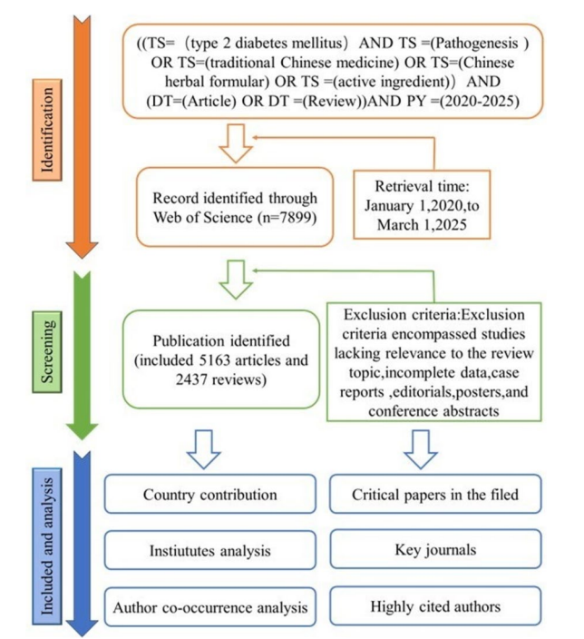 本研究通过PubMed、Science Network、中国知网、百度学术及万方数据库检索,筛选近五年有关T2DM发病机制及传统中医药治疗的中文外文文献,涵盖体外、体内及临床试验,遵循PRISMA 2020指南,重点聚焦胰岛素抵抗、β细胞损伤、糖脂代谢紊乱等病理机制及对应中医复方和活性成分的作用机制与疗效。