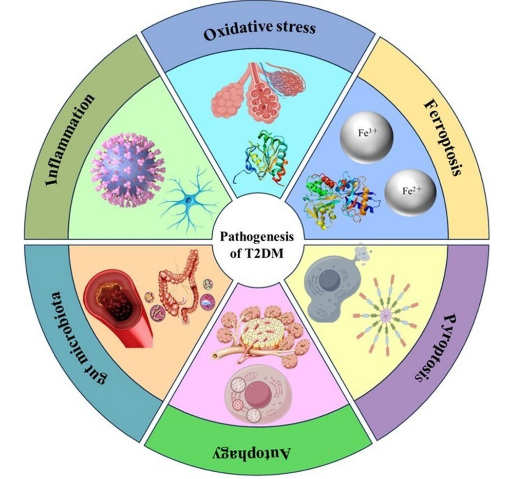 T2DM以胰岛素抵抗为核心病理特征,表现为胰岛素靶组织对正常胰岛素水平响应降低,主要由胰岛素受体及其信号转导异常引起。持续高血糖导致胰岛β细胞功能受损,胰岛素分泌不足,形成恶性循环。研究揭示炎症、氧化应激、铁死亡、焦亡、自噬及肠道菌群失调等多重机制共同参与T2DM发病。