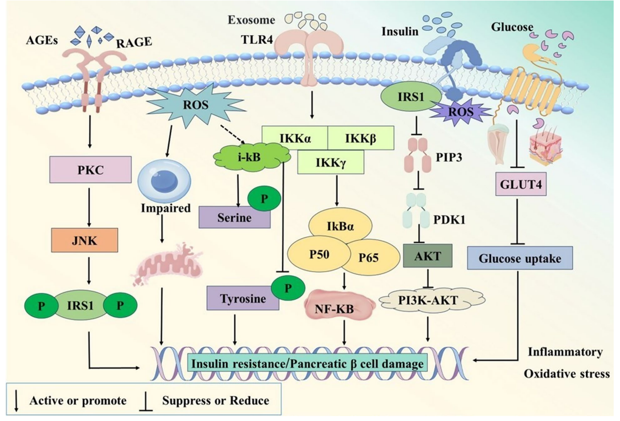 局部组织(如脂肪、肝脏、肌肉)炎症细胞浸润及促炎因子(IL-1β、TNF-α等)过度表达,损伤β细胞并诱导胰岛素抵抗,加重疾病进展。AGEs结合受体激活NF-κB通路,促进炎症级联反应。