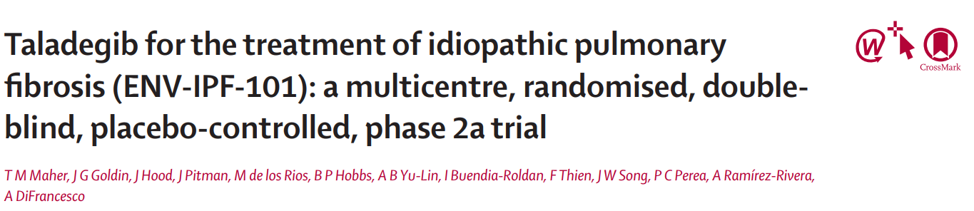 Maher TM, Goldin JG, Hood J, et al. Taladegib for the treatment of idiopathic pulmonary fibrosis (ENV-IPF-101): a multicentre, randomised, double-blind, placebo-controlled, phase 2a trial. Lancet Respir Med. Published online September 30, 2025. doi:10.1016/S2213-2600(25)00239-5